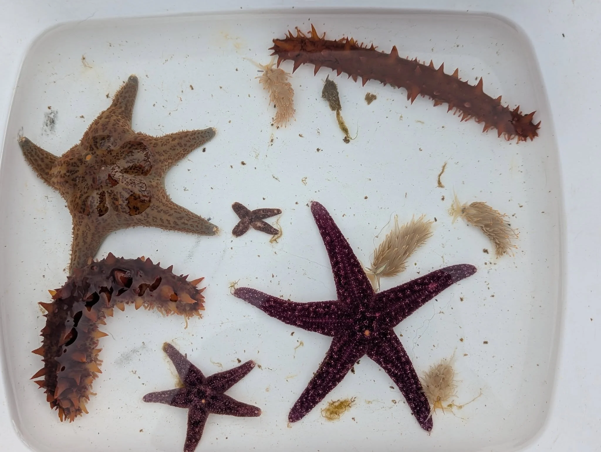 Good news – the herring have hatched! Our curtain checks on Wednesday revealed most of the herring spawn have hatched. One of our curtains in Whiskey Slough had two sea cucumbers, four seastars, five horned nudibranchs, and snails on it. Our curtains have also provided spawning habitat for other species. We have found snail, nudibranch, and tubesnout eggs on the curtains.